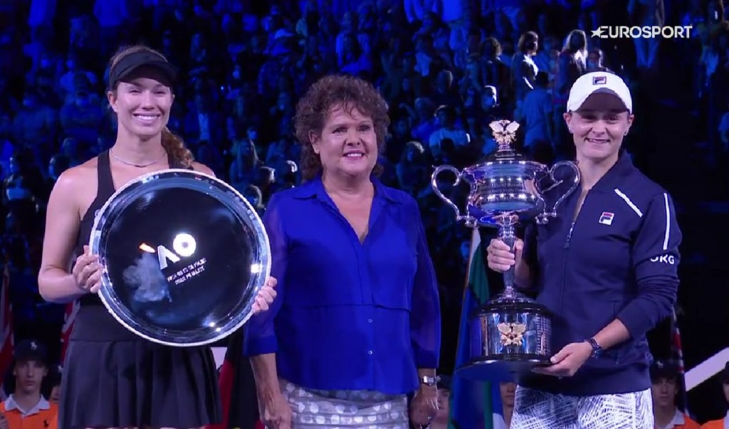 Ultima fusese Chris O’Neil, în 1978. Iar penultima, Evonne Goolagong Cawley, în 1977, de la care Barty, complet surprinsă și emoționată, avea să primească azi trofeul. A fost, de altfel, o surpriză a organizatorilor ca fosta mare campioană să înmâneze trofeele. Evonne este fost lider mondial și câștigătoare a Australian Open în 1974, 1975, 1976 și 1977, a French Open în 1971 și a turneului de la Wimbledon în 1971 și 1980.