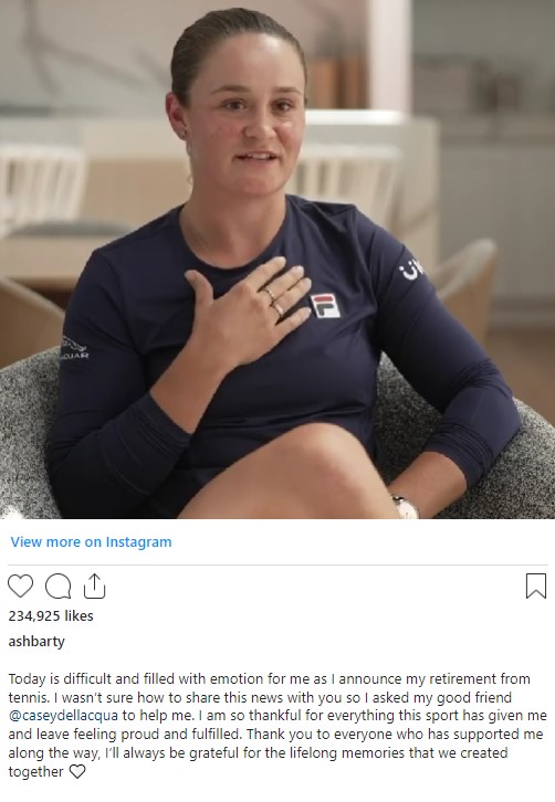 Ashleigh și-a anunțat retragerea într-o discuție emoționantă cu buna ei prietenă și fostă parteneră de dublu, Casey Dellaqua. Ceea ce pare o știre șocantă, un breaking news pentru jurnalele de știri, este atât de firesc și rezonabil explicat de omul Asgleigh Barty, care, la fel ca noi toți, are visuri, își dorește să fie bine și fericită în viața de zi cu zi, alături de familie și prieteni. Este atâta liniște și echilibru în cuvintele acestei fete de 25 de ani, care, aflată pe culmile succesului, are maturitatea și înțelepciunea de a înțelege că trebuie să pună stop carierei ei aflate la apogeu și să facă altceva pentru fericirea și împlinirea ei.
