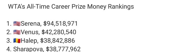 După victoria de azi, Simona urcă și într-un alt top, cel al banilor câștigați din tenis de jucătoare. O depășește pe Maria Șarapova și urcă pe locul 3, după surorile Williams.