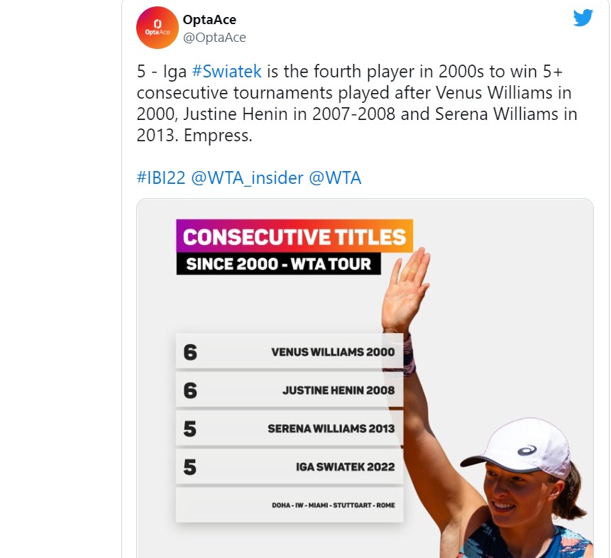Astfel, în ceea ce privește turneele WTA 1000, doar Serena Williams a reușit să câștige mai multe într-un sezon (5, în 2013). Iga are 4, dar suntem abia în luna mai.