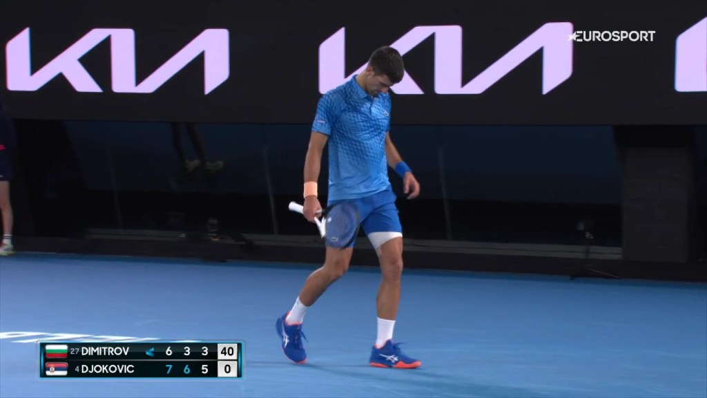La rândul lui, Djokovic, marele absent la ediția din trecută din motive de nevaccinare, a intrat în turneu deja accidentat la picior. După ce cvasinecunoscutul francez Enzo Couacaud, locul 191 ATP, a părut că îi pune probleme în turul doi, după ce i-a luat un set, au existat discuții privind starea fizică a lui Nole și capacitatea lui de a rezista mai departe în turneu. Sârbul a făcut-o cu brio în turul al treilea împotriva fratelui său din Balcani, Grigor Dimitrov. Cu multe intervenții ale fizioterapeutului, Djokovic a jucat și a învins nu doar durerea, ci și pe adversarul său, în mod categoric chiar, în minimum de seturi. Deși bulgarul a revenit spectaculos după ce fusese condus cu break și a trimis primul set în tiebreak, ba chiar a avut mingi de set, campionul sârb s-a impus până la urmă. Cu primul set câștigat, chiar dacă chinuit, Djokovic a avut mai puține probleme în următoarele două seturi, 6-3, 6-4, pentru a ajunge la 10 victorii din 11 meciuri jucate împotriva fostului iubit al Mariei Șarapova.